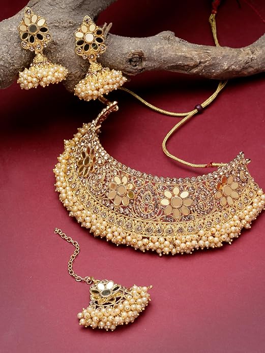 • Timeless Beauty: Sukkhi presents a stunning jewelry set featuring a gold-plated choker necklace adorned with intricate gold Kundan and beads in an exquisite floral design, accompanied by matching earrings and maangtika, embodying the enduring allure of traditional Indian jewelry.