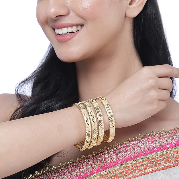 • What You Get:- Set Of 4 Gold-Plated Classic Paisley Shaped Textured Handcrafted Bangles, secured with Slip-On closure.